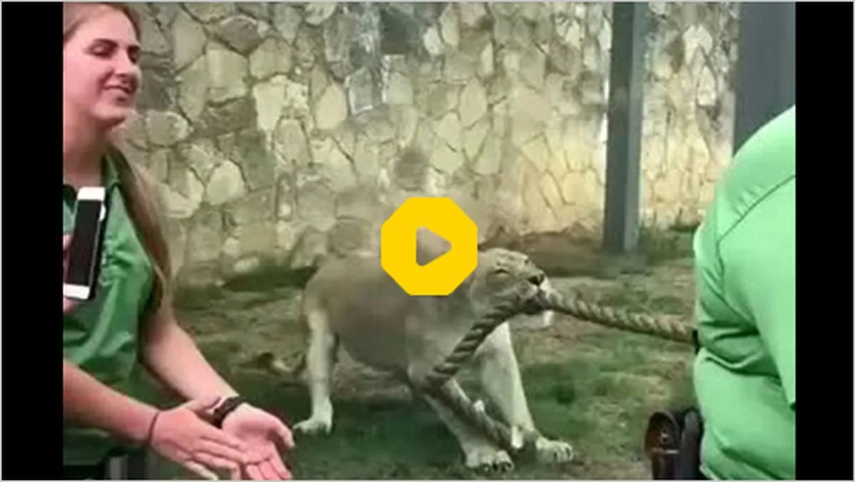 ویدیویی تماشایی از لحظه مسابقه طناب کشی با شیر را تماشا کنید.