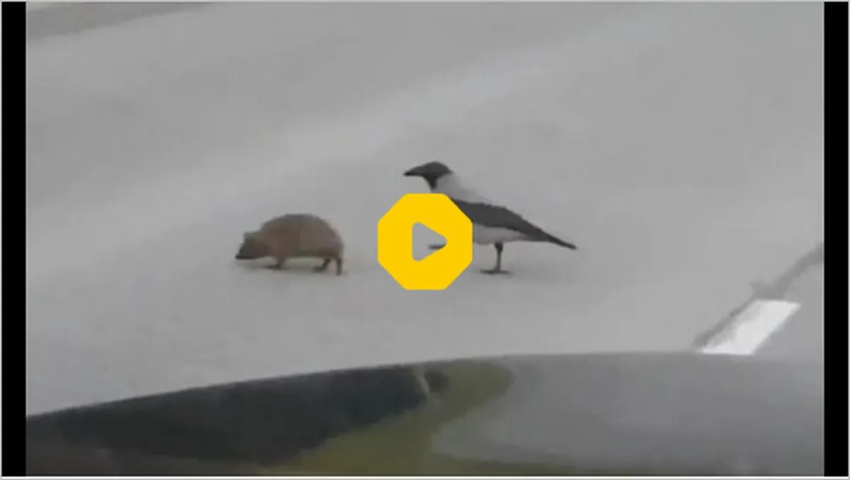 ببینید: کلاغ یک جوجه تیغی را از اتوبان رد کرد!