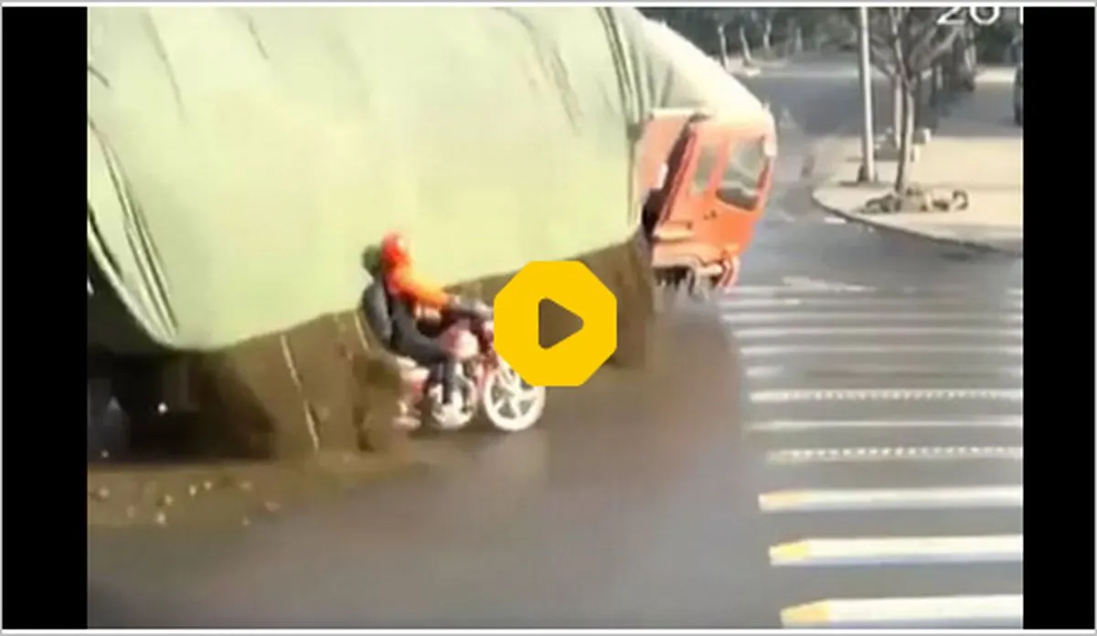 یک کامیون در حال زیر گرفتن موتورسوار چینی بود، اما بخت با راکب موتور یار بود و او زنده ماند.
