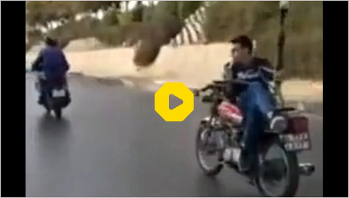 ببینید | جوانی که بدون توجه به عواقب کارش حرکات عجیب روی موتور انجام میدهد !