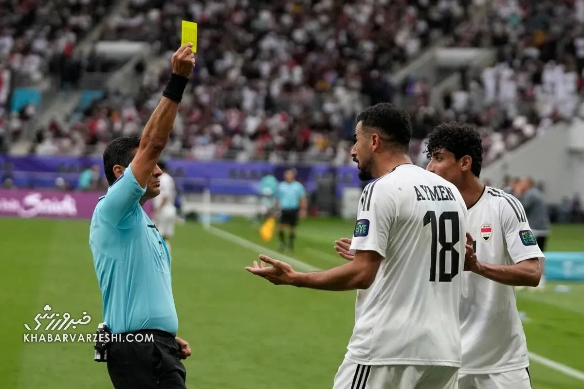 تصمیم به صدور کارت زرد دوم برای بازیکن شماره ۱۸ عراق در دقیقه ۷۷، ایمن حسین، بر اساس قانون ۱۲ (خطاها و تخلفات - اقدام انضباطی: تاخیر) بود که به موجب آن داور باید به بازیکنانی که بیش از حد شروع مجدد را به تاخیر میاندازند، اخطار دهد. ایمن حسین پس از به ثمر رساندن گل در دقیقه ۷۵، شروع مجدد بازی را بیش از حد به تاخیر انداخت. در جریان جشنهای این بازیکن، داور سه بار به ایمن حسین اخطار جدی داد تا در نهایت کارت زرد دوم را به او نشان دهد. در این خصوص دومین اخطاری که به ایمن حسین صادر شد تصمیم صحیح داور بود.
