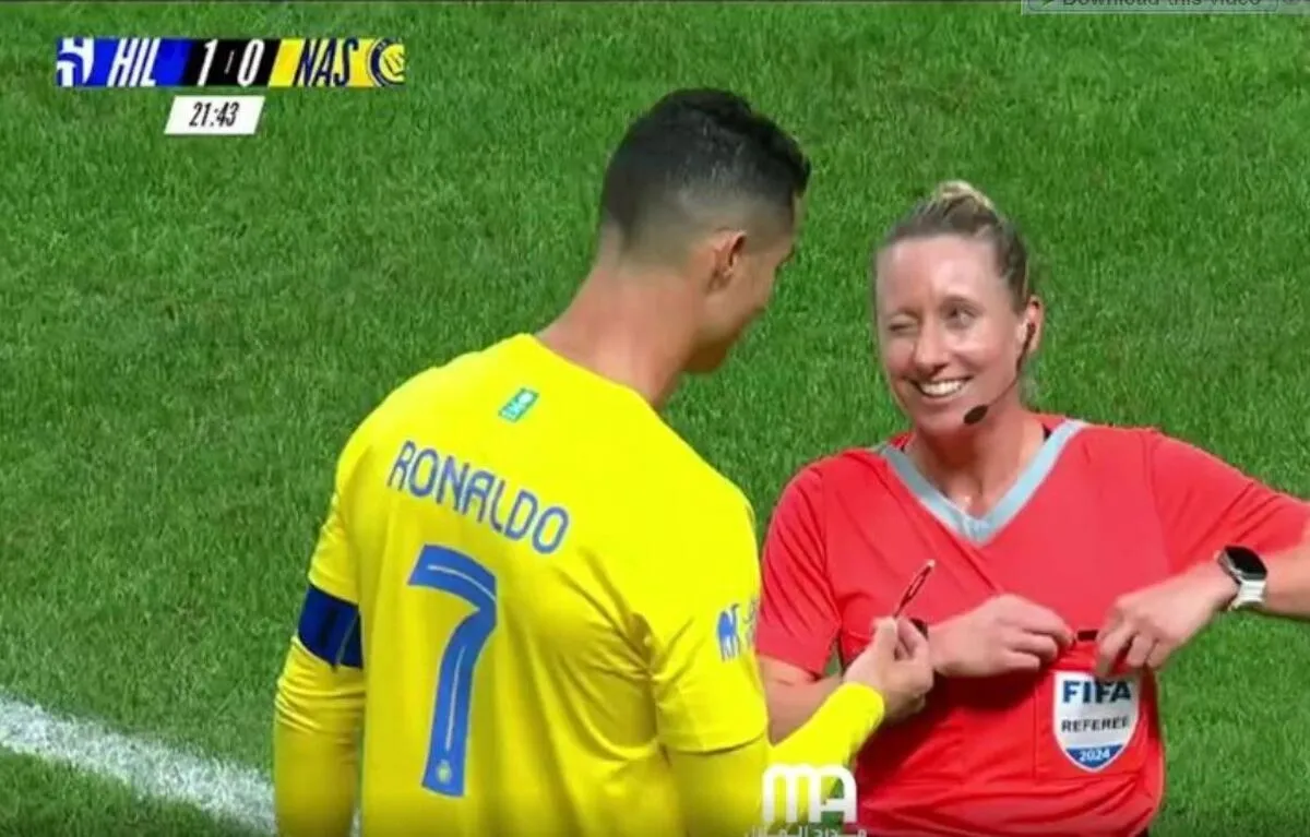 تصویری جالب که به شکل ناگهانی از بازی شب گذشته النصر و الهلال شکار شده و کاربران فکر می کنند که خانم داور به رونالدو چشمک زده است.