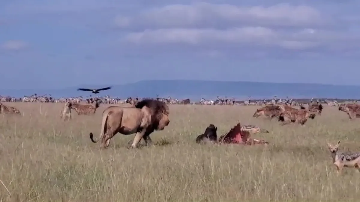 یک شیر نر با مشاهده قبیله کفتار‌ها که درحال خوردن لاشه یک بوفالو بودند، بدون سر و صدا وارد صحنه شده و غذای آن‌ها را دزدید.