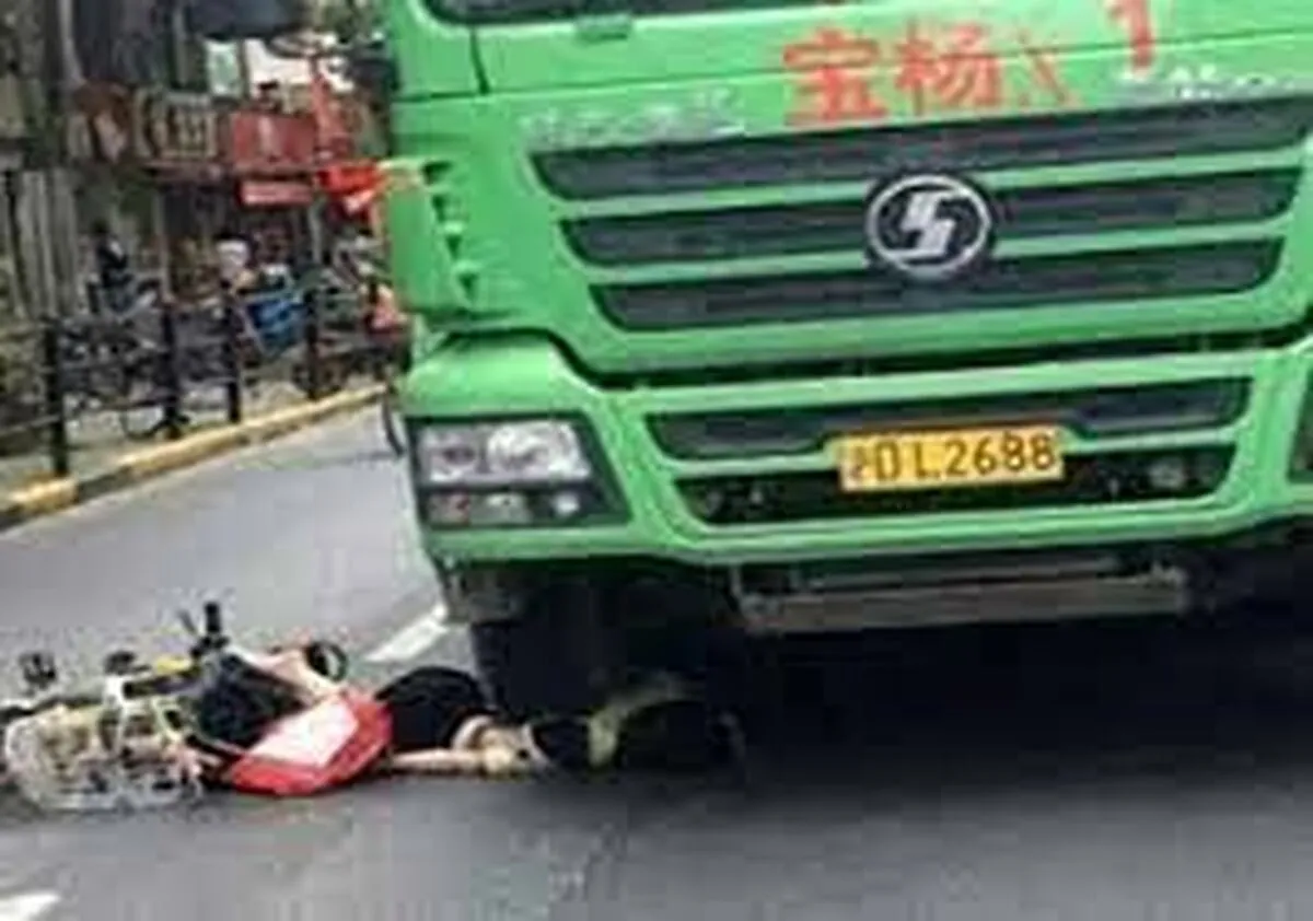 فیلم دوربین‌های مداربسته نشان می‌دهد یک زن جوان از له شدن زیرچرخ‌های کامیون نجات پیدا می‌کند.