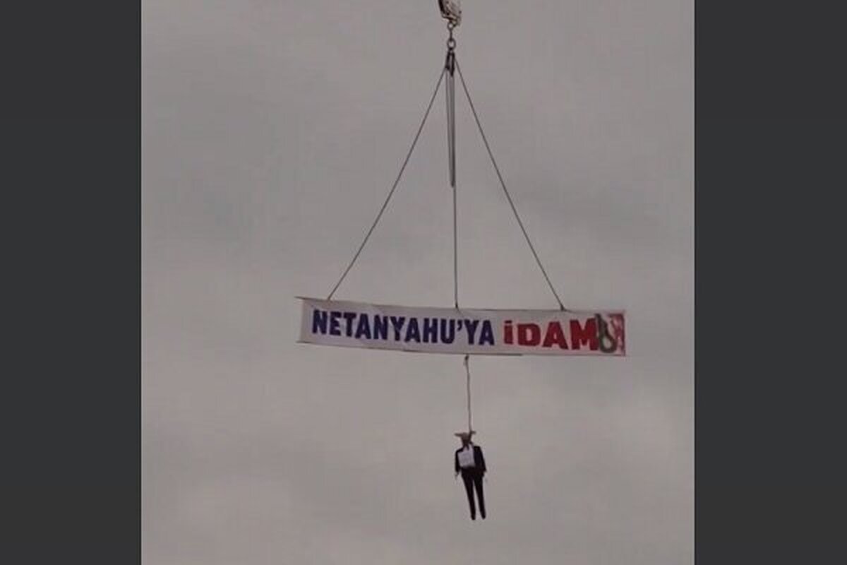 نصب بنری با نوشته «اعدام نتانیاهو» و ماکتی از نخستوزیر رژیم صیونیستی بر روی جرثقیل در ترکیه