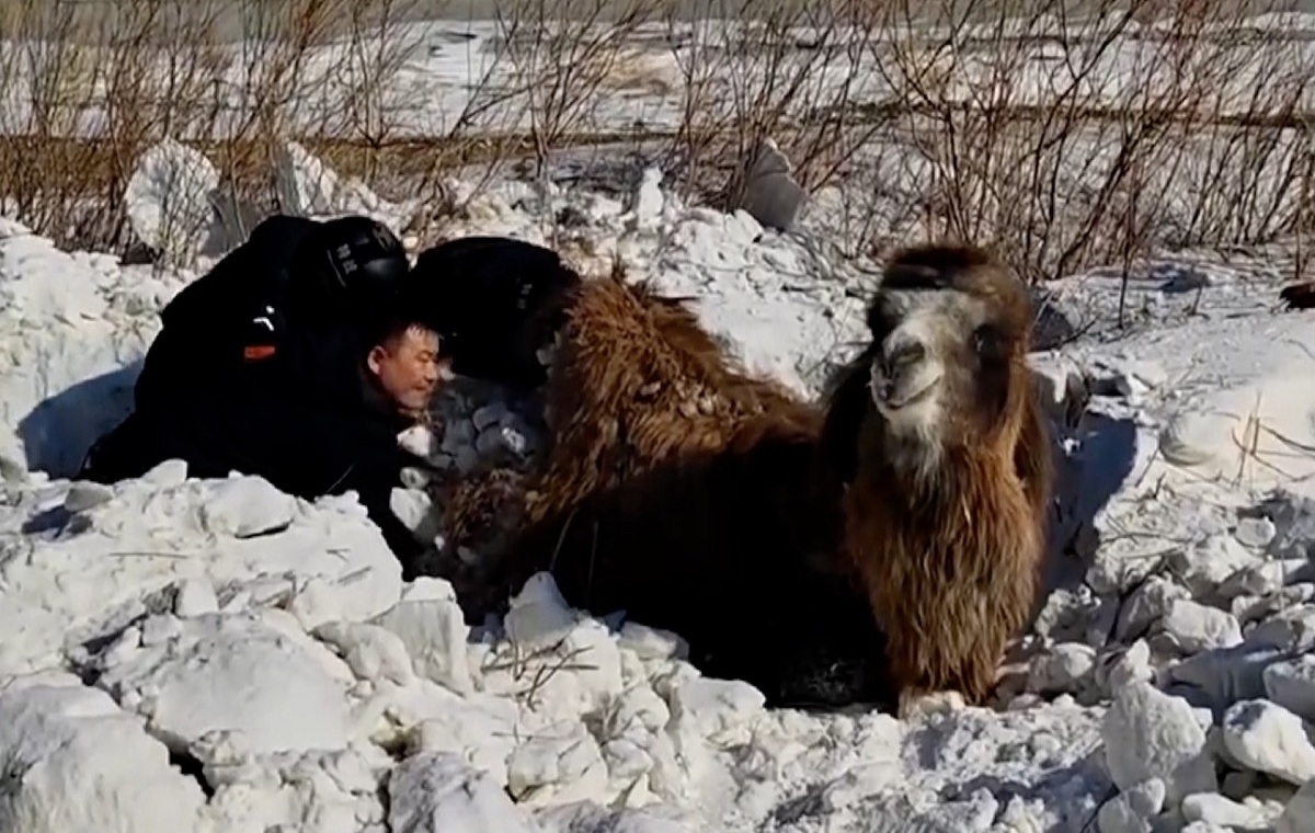 گروهی از نیروهای پلیس در منطقه خودمختار سین کیانگ چین با وجود سرمای منفی ۲۴ درجه سانتیگراد برای نجات شتر مدفون در برف تلاش کردند.