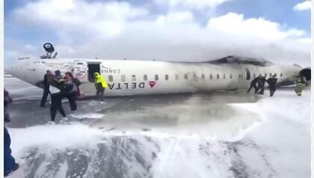 تصاویری از صحنه حادثه نشان میدهد که یک هواپیمای «دلتا ایر لاین» روی آسفالت برعکس شده و افراد در حال دور شدن از آن هستند.